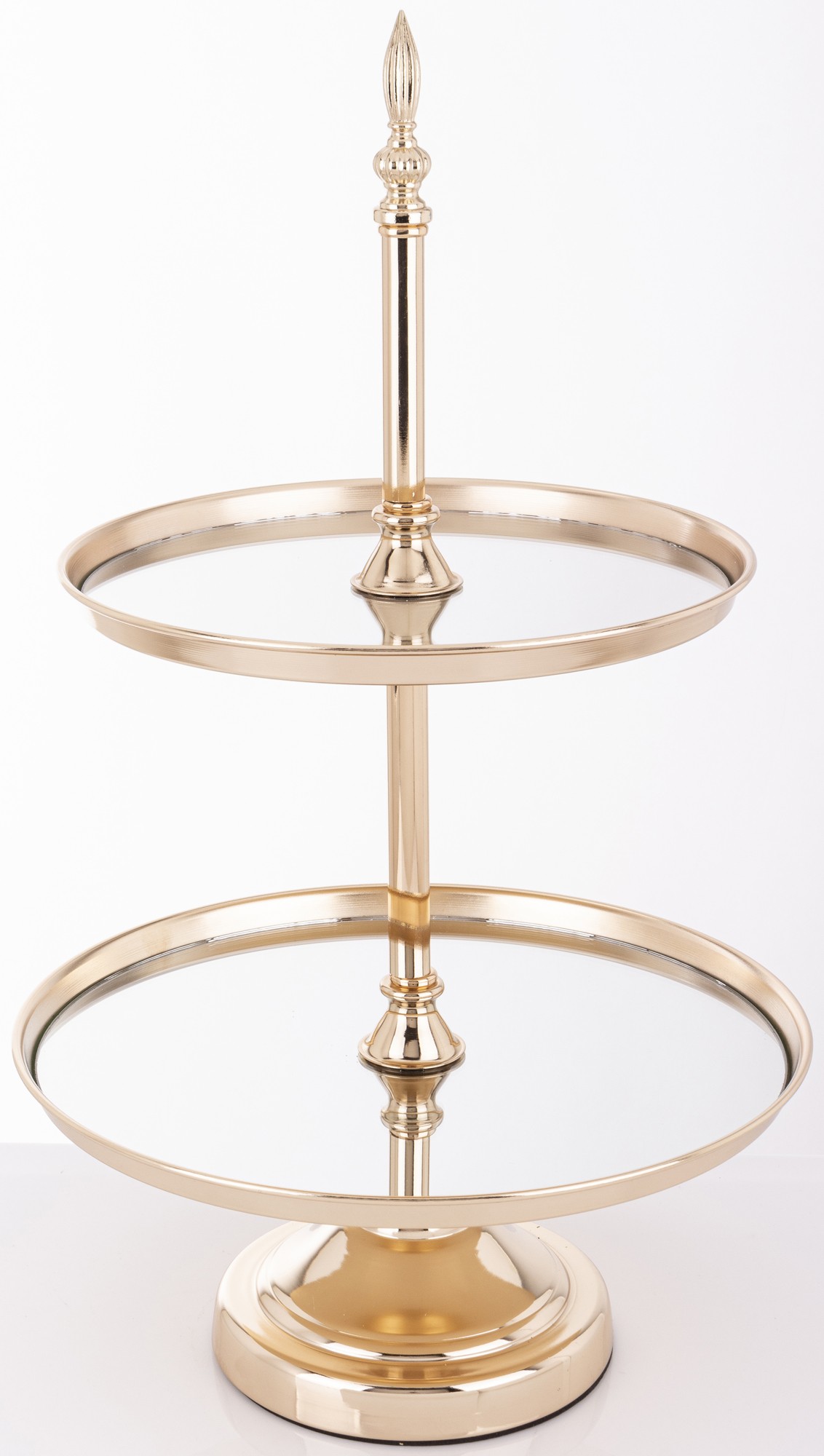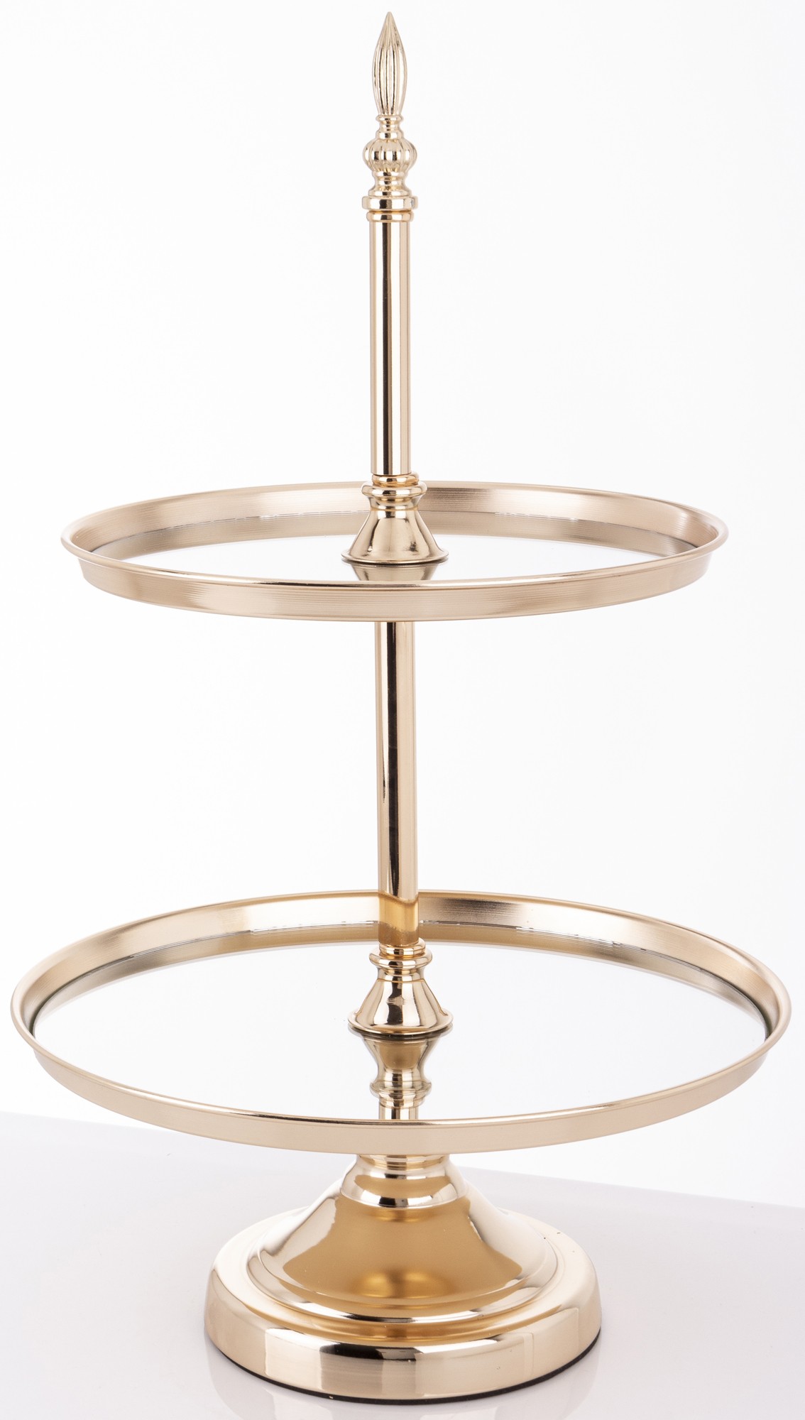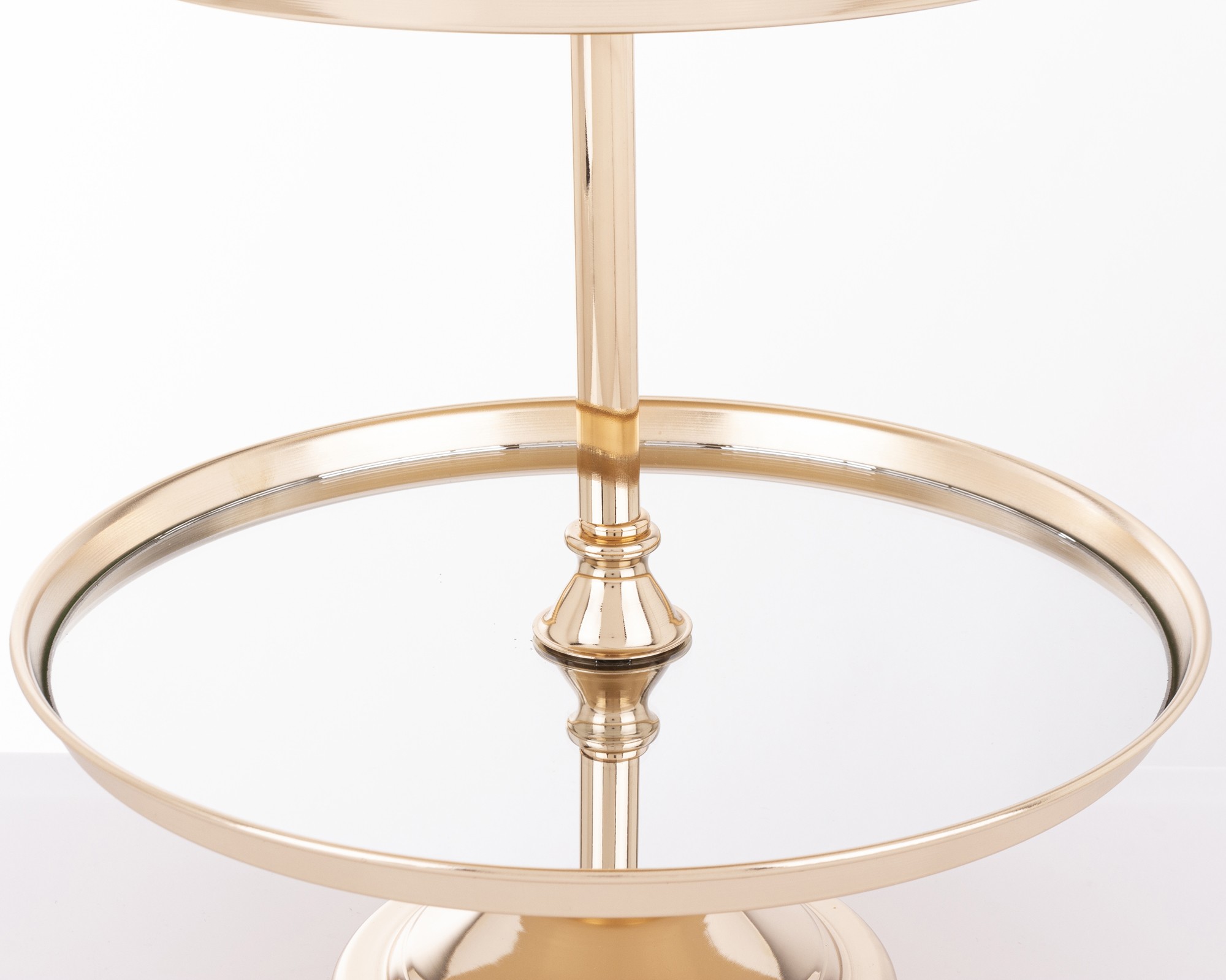 Náš elegantný zrkadlový etažér s dvoma poschodiami je dokonalým riešením pre ľudí, ktorí hľadajú krásnu a štýlovú dekoráciu pre svoj domov. Tento etažér vyrobená z vysoko kvalitného skla a kovu sa vyznačuje jedinečnou kombináciou moderného dizajnu a klasickej elegancie. Zlatý povlak na kovovom ráme dodáva jedinečný vzhľad, ktorý dokonale zapadá do trendov interiérového dizajnu. Dve sklenené úrovne umožňujú umiestniť rôzne druhy jedla a dekorácie.