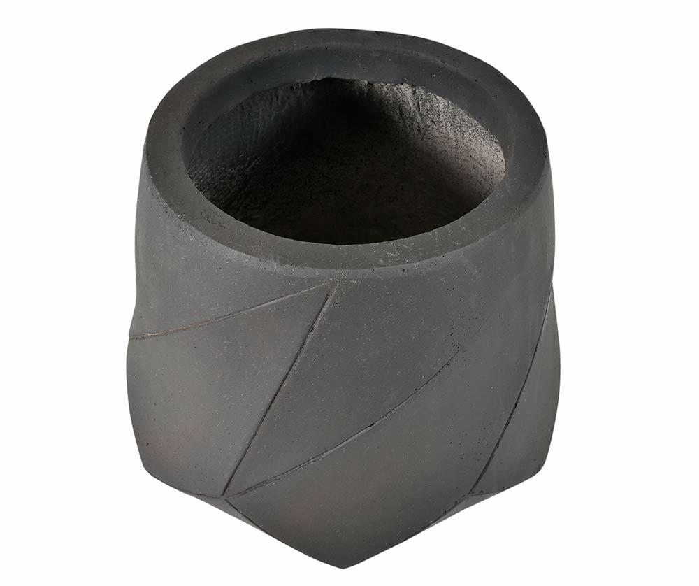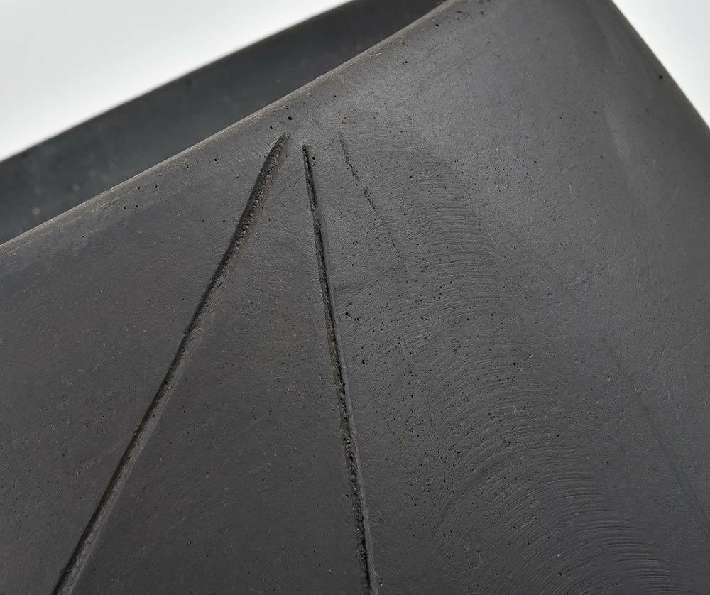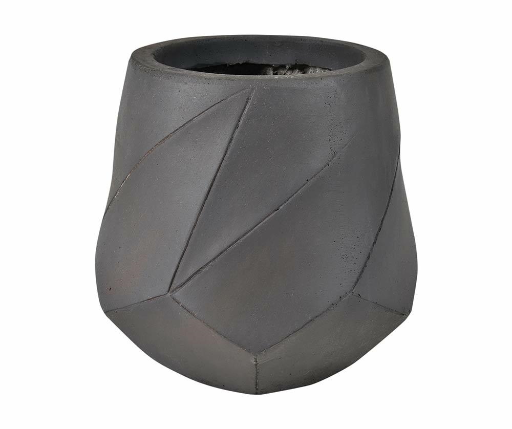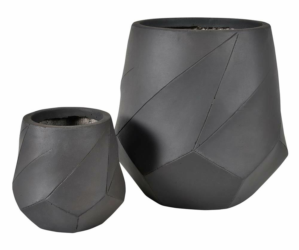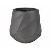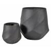 Moderný čierny kvetináč s geometrickými vzormi je vyrobený z vláknitej hliny, ktorá je pevná, ľahká a odolná voči vlhkosti a poveternostným vplyvom.