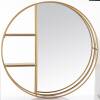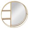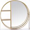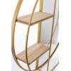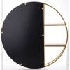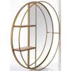 Závesná okrúhla polica s dvomi policami na jednej strane a zrkadlom na druhej strane je nevšedným a funkčným dekoratívnym prvkom, ktorý spája praktické využitie s estetikou.
